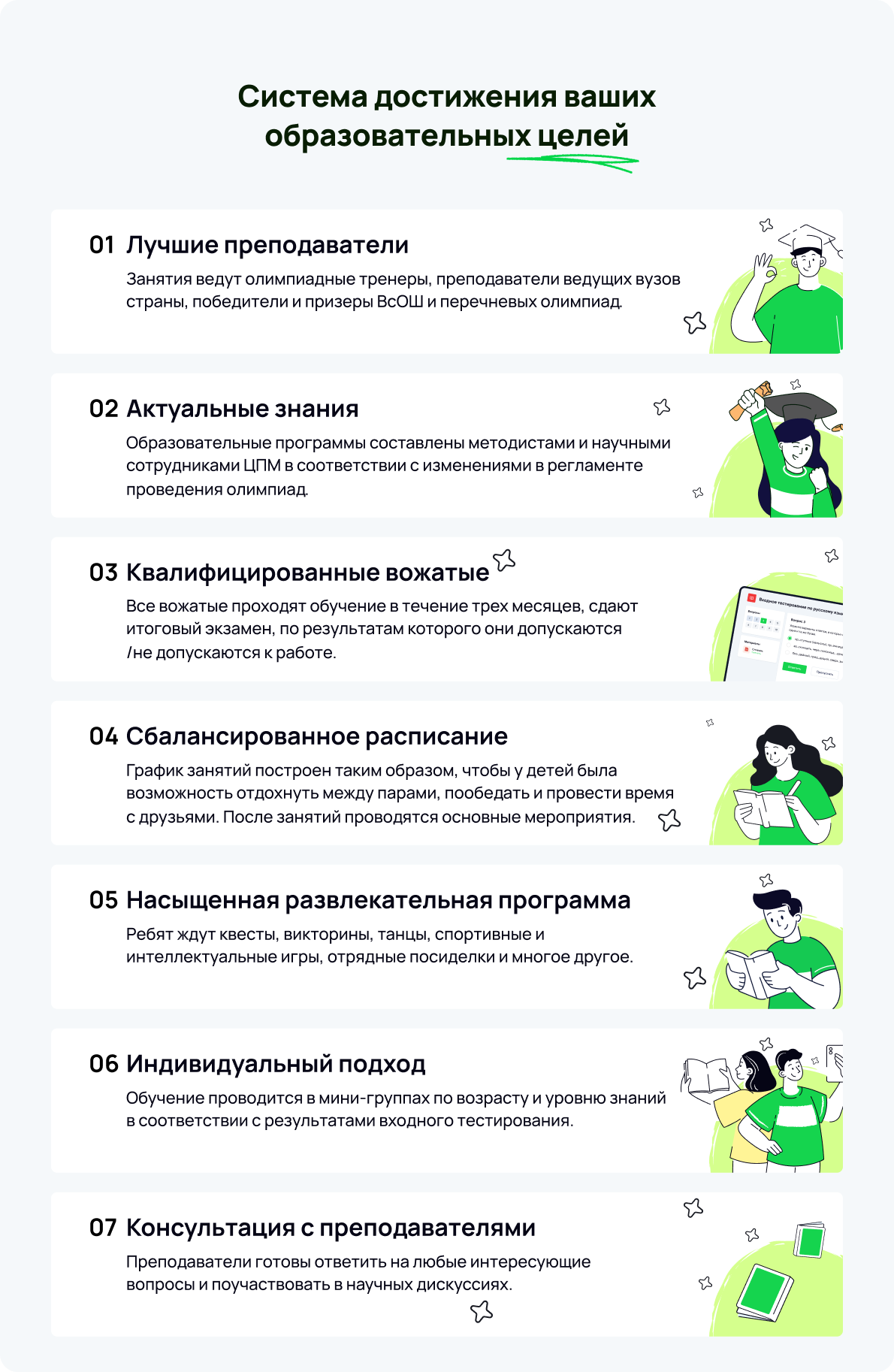 С учениками всегда рядом опытные вожатые, прошедшие специализированное обучение. Вожатые готовят творческие мероприятия и помогают с бытовыми вопросами. В свободное от учёбы время ученики могут участвовать в крутых вожатских активностях, отдыхать или повторять пройденный материал.